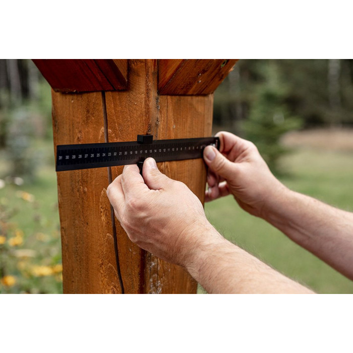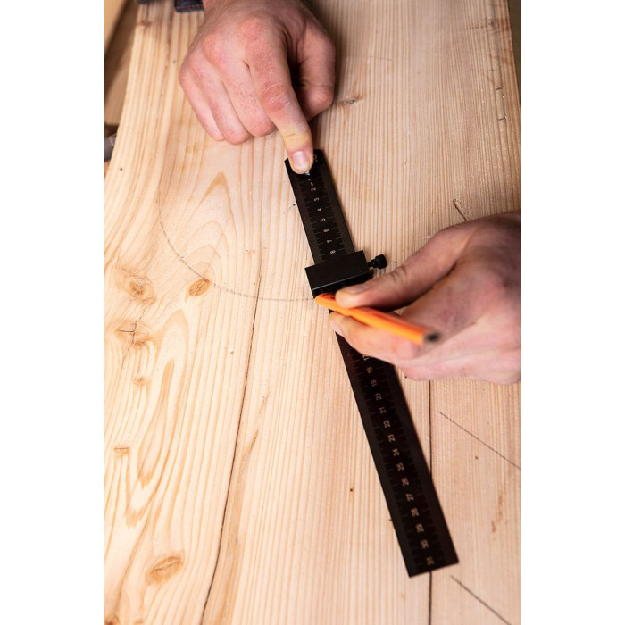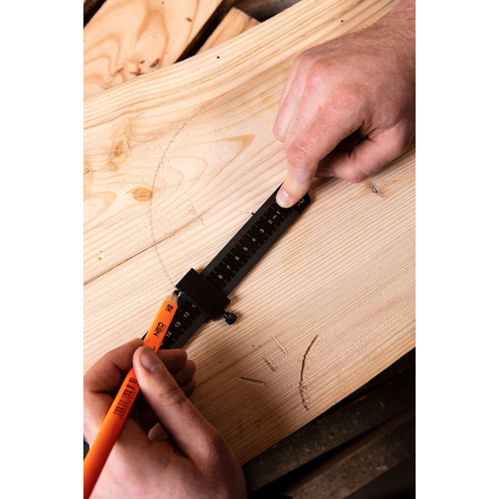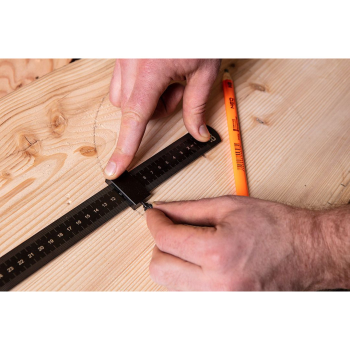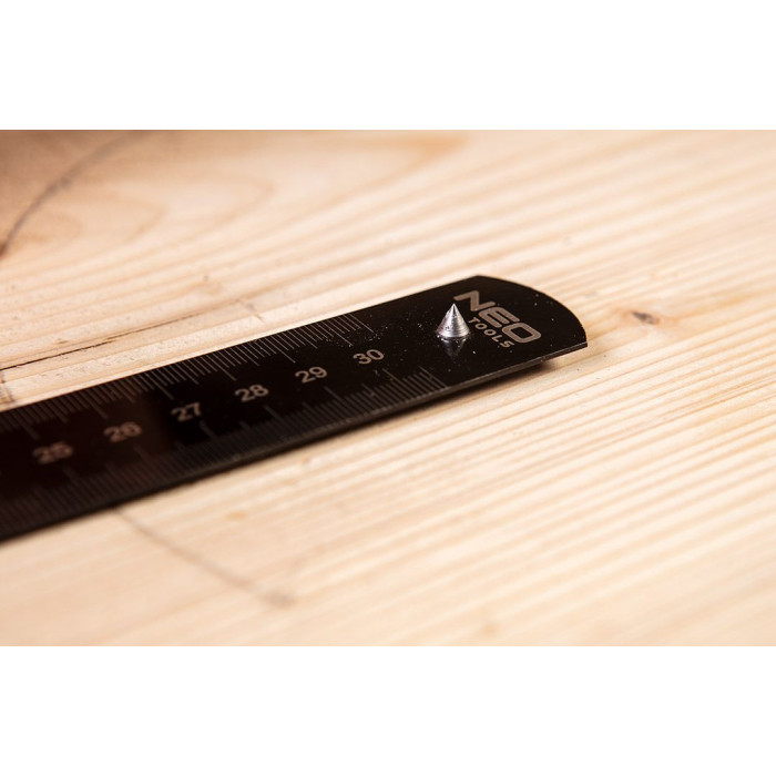 Лінійка NEO з упором (арт. 72-200) і довжиною 30 см зі шкалою в см з обох боків. Лінійка виготовлена з нержавіючої сталі, регульований упор - з алюмінію. Додатково лінійка оснащена сталевим писалом.