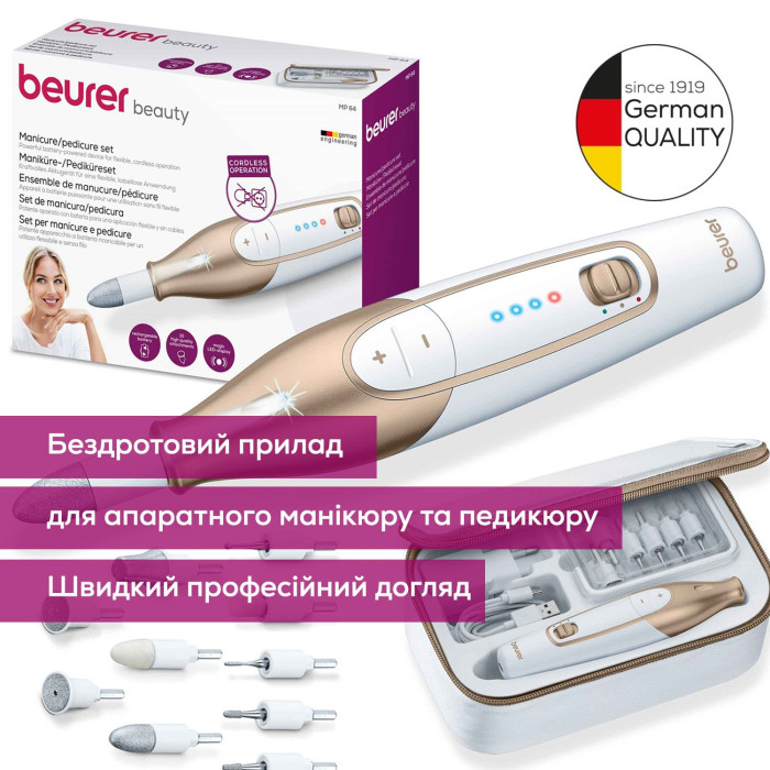 Манікюрний набір Beurer MP 64 використовується для догляду за нігтями рук і стоп. Прилад підтримує кілька швидкісних режимів для виконання манікюру та педикюру. Світлодіодне підсвічування покращує видимість під час роботи. Вбудований акумулятор забезпечує бездротове використання. Комплект насадок дозволяє виконувати різні процедури догляду за нігтями.