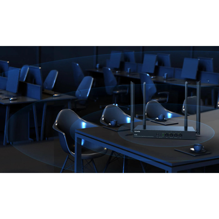 Маршрутизатор TENDA W18E Hotspot AC1200 підтримує швидкість Wi-Fi до 1200 Мбіт/с (2.4 ГГц + 5 ГГц), має 4 гігабітні порти та функцію Captive Portal на 50 акаунтів. Забезпечує стабільну роботу до 80 користувачів з підтримкою VPN, фільтрації та керування пропускною здатністю.
