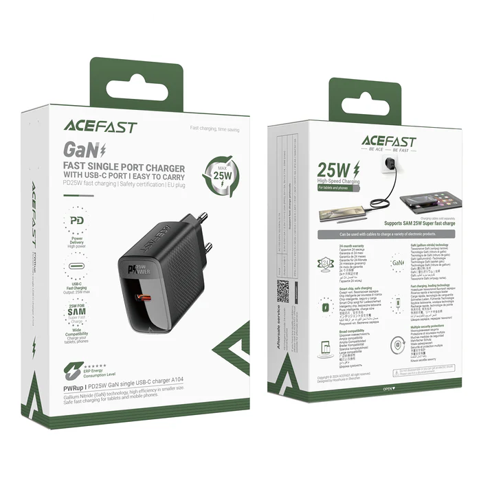 Мережевий зарядний пристрій ACEFAST A104 PD25W GaN single USB-C charger Black — є компактним та потужним пристроєм для швидкої зарядки вашого телефону або смартфона. Завдяки технології GaN, воно забезпечує швидку та ефективну зарядку з меншим споживанням енергії. Цей пристрій є не тільки потужним, але й дуже зручним у використанні та переносі.