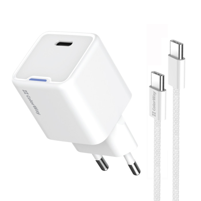 Мережевий зарядний пристрій ColorWay GaN Mini 25W PD Port PPS USB-C White (CW-CHS052PDC-WT) + кабель USB Type-C