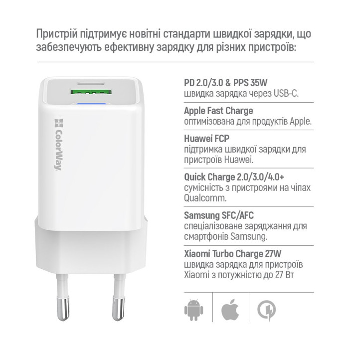 Мережевий зарядний пристрій ColorWay GaN Mini 35W PD Port PPS USB (Type-C PD + USB QC4.0) White (CW-CHS055PDC-WT) + кабель USB Type-C