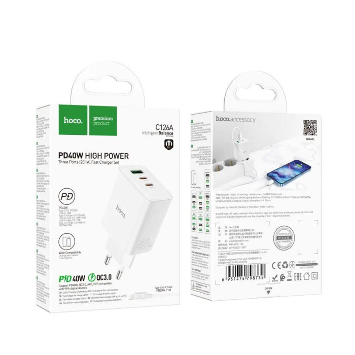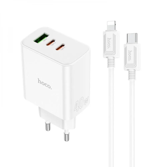 Мережевий зарядний пристрій HOCO C126A Pure power PD40W three-port(2C1A) charger set(C to iP) White