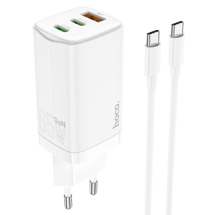 HOCO N16 Scenery 65W three-port(2C1A) charger set(Type-C to Type-C) White – феноменально потужний зарядний пристрій, оснащений одним роз'ємом USB і двома роз'ємами Type-C. Потужність першого роз'єму Type-C становить 65W, другого – 33W, а порт USB має потужність 30W.Зарядка має міцний вогнестійкий корпус з полікарбонату, який має розміри 103*36*32мм та важить 87 грамів. У комплект входить кабель Type-C – Type-C на 100W, довжина 1 метр. Даним адаптером можна заряджати навіть ноутбуки!Мережевий зарядний пристрій зроблено за технологією GaN, а значить він краще протистоїть нагріванню, споживає менше енергії і заряджає гаджети швидше, ніж звичайні зарядки.Особливості: