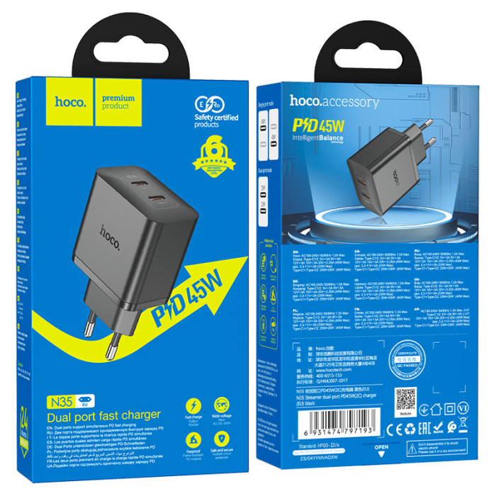 Мережевий зарядний пристрій HOCO N35 Streamer має два порти Type-C для ефективного заряджання ваших девайсів. Він сумісний з багатьма сучасними пристроями: повербанками, смартфонами, планшетами, акустичними системами різних виробників. Максимальна вихідна потужність адаптера становить 45 W. Є підтримка протоколів швидкої зарядки PD45W, PPS, QC3.0, FCP, AFC та інших. Корпус з PC не тільки надає стильного вигляду, але й має вогнестійкі властивості, що робить його безпечним у використанні. Компактний розмір гарантує, що зарядний пристрій буде вашим надійним супутником у будь-якій подорожі, забезпечуючи швидку та ефективну зарядку ваших улюблених гаджетів, де б ви не знаходилися. Високоякісні матеріали та виробничі стандарти забезпечують довговічність та надійність зарядного пристрою.