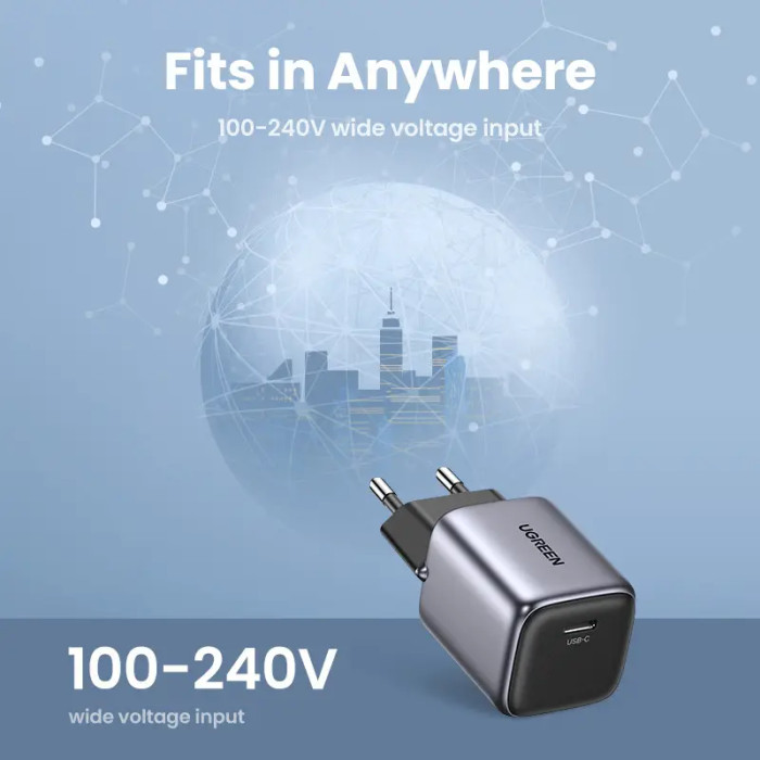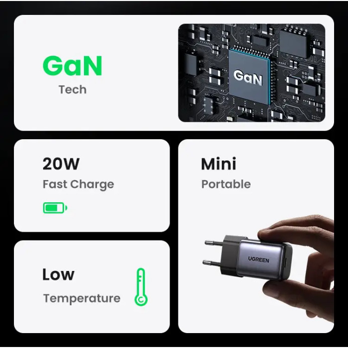 Зарядний пристрій UGREEN CD318 Nexode mini 20W Charger EU (UGR-90664) зможе зарядити ваші пристрої за дуже короткий час, що робить його ідеальним вибором під час роботи в офісі або вдома. Потужність зарядного пристрою становить 20 Вт. Завдяки технології виробництва зарядний пристрій має порівняно невеликі розміри. Модель CD318 підтримує протоколи швидкого заряджання, у тому числі: PD, QC, AFC, SCP, FCP, PPS, що також робить її використання безпечним. Ви можете бути впевнені, що зарядний пристрій відрегулює поточне значення відповідно до потреб вашого пристрою.КОМПАКТНІ РОЗМІРИЗберігайте зарядний пристрій так, як вам зручно. Киньте його у сумочку чи кишеню, тримайте у шухляді столу. Він не займе багато місця та не перевантажить ваш багаж.ЯКІСТЬ ВИГОТОВЛЕННЯЦей зарядний пристрій хоч і маленький, але відрізняється виключно міцними матеріалами. Завдяки їм ви можете бути впевнені, що він не трісне і не подряпається.