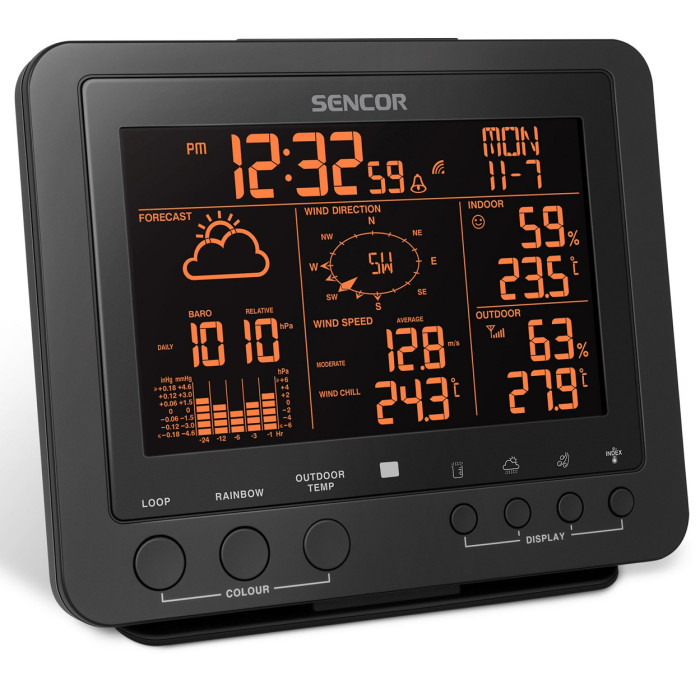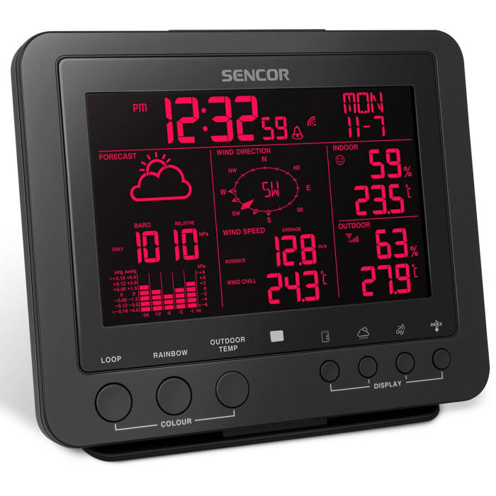Метеостанція Sencor, внутр/зовн вимірювання, від мережі/CR2032x1+AAx3, темп-ра, вологість, час, прогноз погоди, атмосферний тиск, шв. вітру, чорний