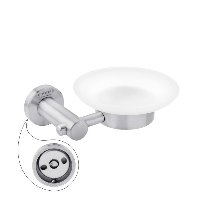 Мильниця Kroner KRP Edelstahl Klassisch - ESG3702 міцно кріпиться до стіни, містить тримач та скляну чашу. Виріб виготовлений із якісного та довговічного металу. Мильниця знімна, завдяки чому догляд за нею буде простим і легким. У виробі використовуються ущільнювальне кільце (прокладка), необхідне для щільного з'єднання металу та скла, що також перешкоджають виникненню шуму внаслідок зіткнення частин виробу. На тримач нанесений фірмовий логотип компанії.