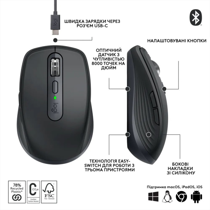 Миша MX Anywhere 3S тепер також оснащена оптичним датчиком чутливістю 8000 точок на дюйм, що забезпечує найвищу швидкодію на будь-якій поверхні, навіть на склі.