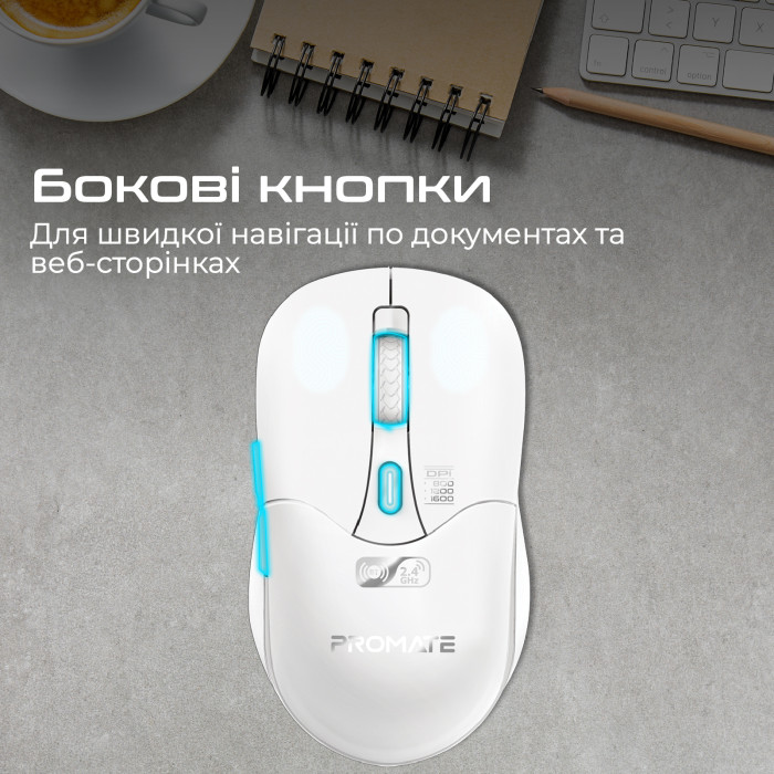 Samo - ергономічна бездротова миша від Promate. Зручне керування, 70 годин роботи на одному заряді батареї та 2 варіанти підключення роблять її практичним вибором для щоденного використання.