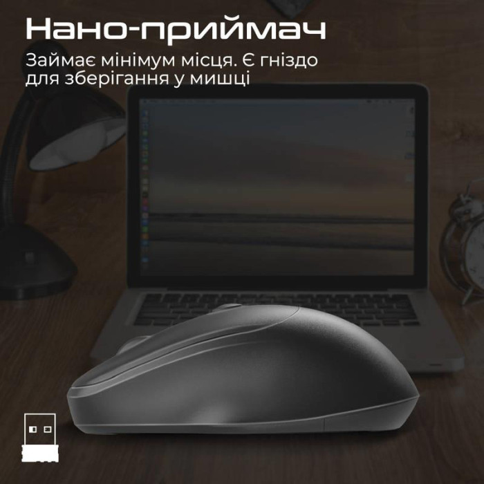 Нано-приймач: Займає мінімум місця. Є гніздо для зберігання у мишці.