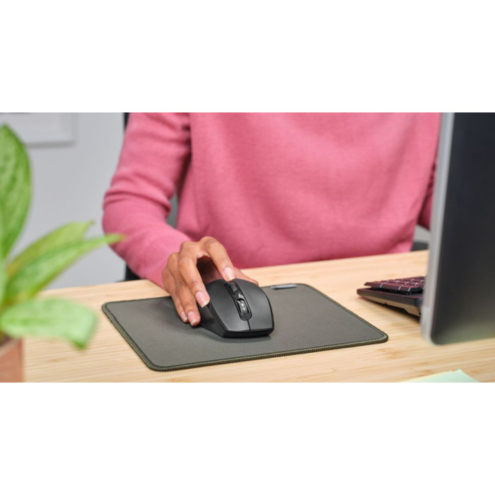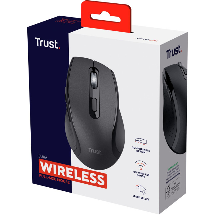 Бездротова миша Trust Sura (WL) чорного кольору має ергономічний дизайн і прогумовані краї для комфортного використання. Вона оснащена оптичним сенсором з регульованою чутливістю від 800 до 1600 DPI, що дозволяє налаштувати швидкість курсора під ваші потреби. Миша має шість кнопок, включаючи дві бічні кнопки та кнопку вибору DPI. Діапазон бездротового підключення становить до 10 метрів, що забезпечує свободу руху.