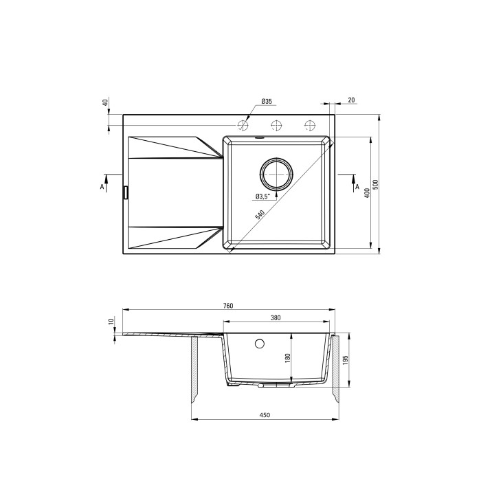Мийка кухонна Deante Evora, граніт, прямокутна, з крилом, 760х500х195мм, чаша - 1, врізна, графіт