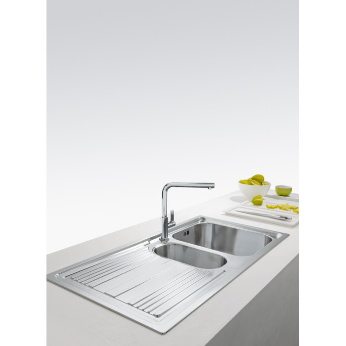 Мийка Franke Logica Line – це мийка з великою і малою чашами, а також функціональним крилом, що служить для сушіння посуду або обробки продуктів. Завдяки нахилу, вода стікає без затримок у чашу мийки. Монтаж цієї раковини franke здійснюється врізним способом – швидко і просто, навіть без спеціальних навичок. Отвір під змішувач передбачений у конструкції.