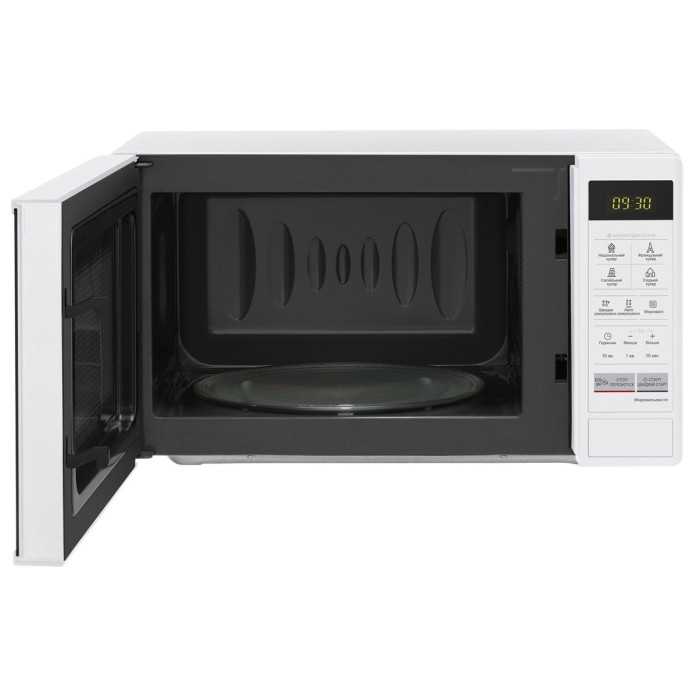 Поворотний столик, діаметр якого становить 245 мм, дозволить Вам розмістити всі необхідні продукти. Вбудована функція автоприготування надасть Вам можливість доводити улюблені страви до готовності простим натисканням декількох клавіш, а чотири режими авторозморожування позбавлять від необхідності чекати, поки заморожені м"ясо або риба будуть придатні для подальшого приготування. Міцне внутрішнє покриття відмінно чиститься і стійко до можливих пошкоджень. Додатковою перевагою пропонованої моделі є її оригінальний дизайн, в якому сріблястий колір корпусу з"єднаний з лаконічністю деталей.