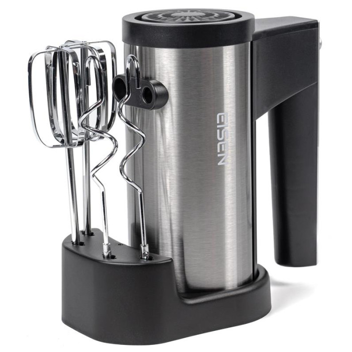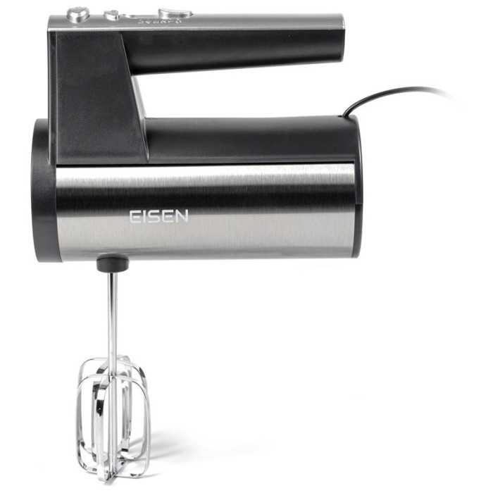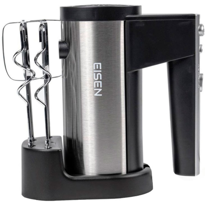 Легка та компактна модель EISEN EHM-05B представлена у стильному чорному кольорі з ефектними металевими вставками. Корпус міксера виготовлений з якісного пластику, а вінчики для збивання та гаки для тіста – хромованої сталі. Унікальна особливість моделі – підставка, призначена для зручного зберігання приладу та насадок.