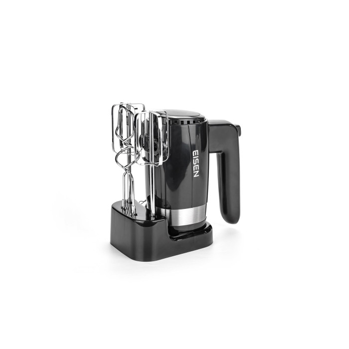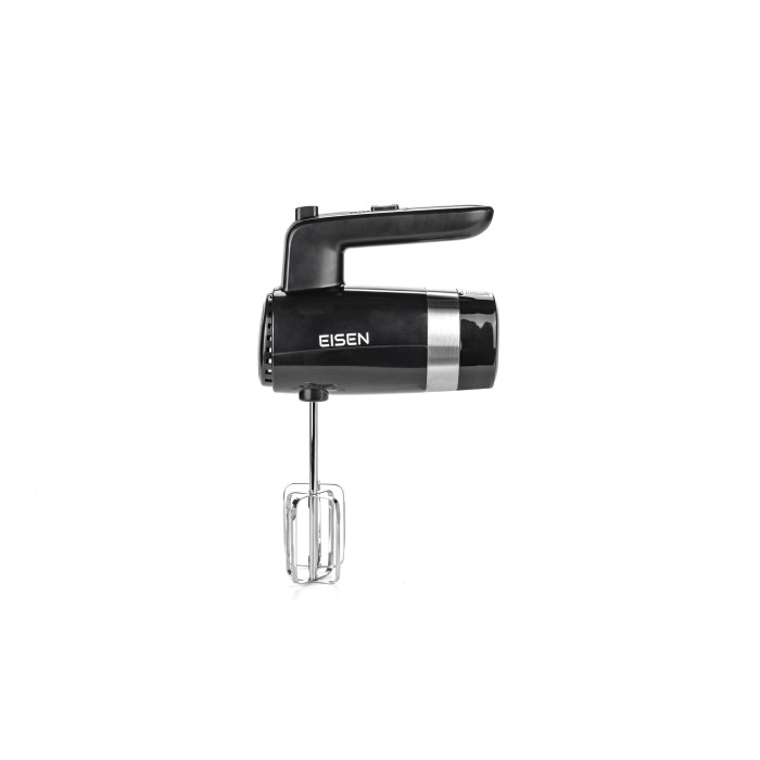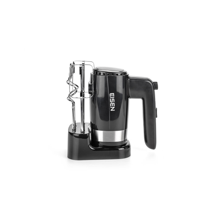 Ручний міксер EISEN EHM-50 є універсальною моделлю "2 в 1" і надійним помічником на кухні. Він має потужність 500 Вт і швидко впорається з різними кулінарними завданнями. У нього є два вінчика для збивання та два гаки для тіста, а також п’ять ступенів регулювання швидкості та турбо-режим. Головною особливістю цієї моделі є підставка для зберігання міксера та насадок. Щоб забезпечити безпечну роботу пристрою, він має функцію захисту від перегріву.