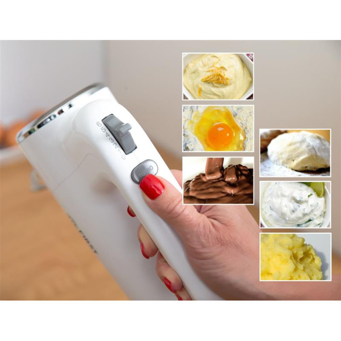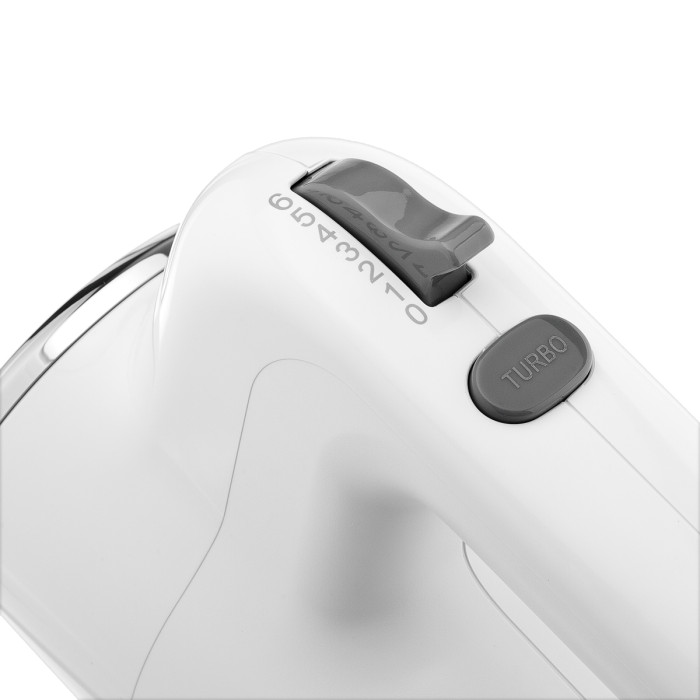 Техніка має 6 основних швидкостей, перемикаючись між якими ви зможете підібрати оптимальний рівень дії у кожному конкретному випадку. При цьому є виділена кнопка для активації турборежиму. Він задіює весь ресурсопотенціал міксера, додавши насадкам максимальный крутящий момент.
