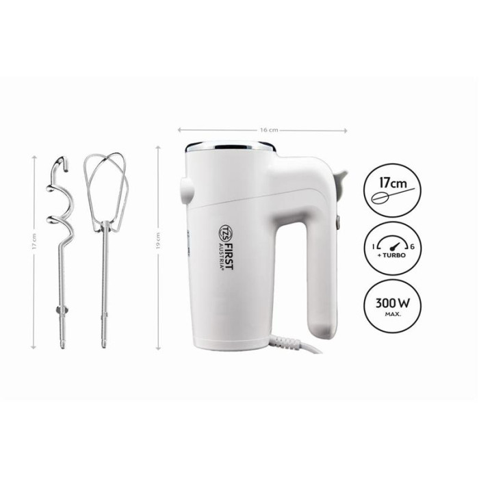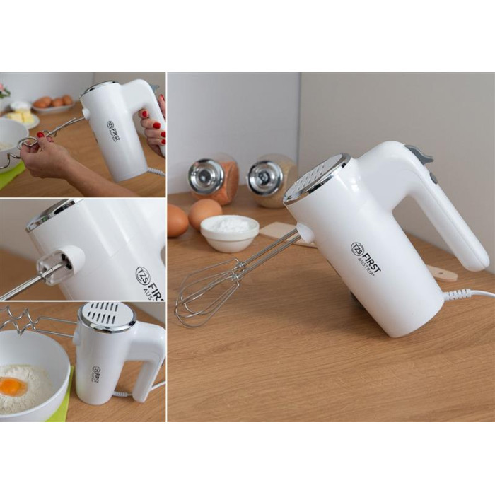 Міксер First FA-5263-2 має корпус, який ідеально лягає в руку, дозволяючи вам активно переміщати прилад для досягнення оптимальної консистенції складу, над яким ви працюєте. Такий тип впливу гарний практично, т.к. ручним електричним міксером можна збити та змішати практично все, при цьому з великою зручністю. Потужність моделі дорівнює 300 Вт.