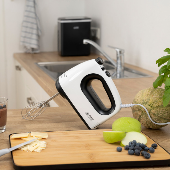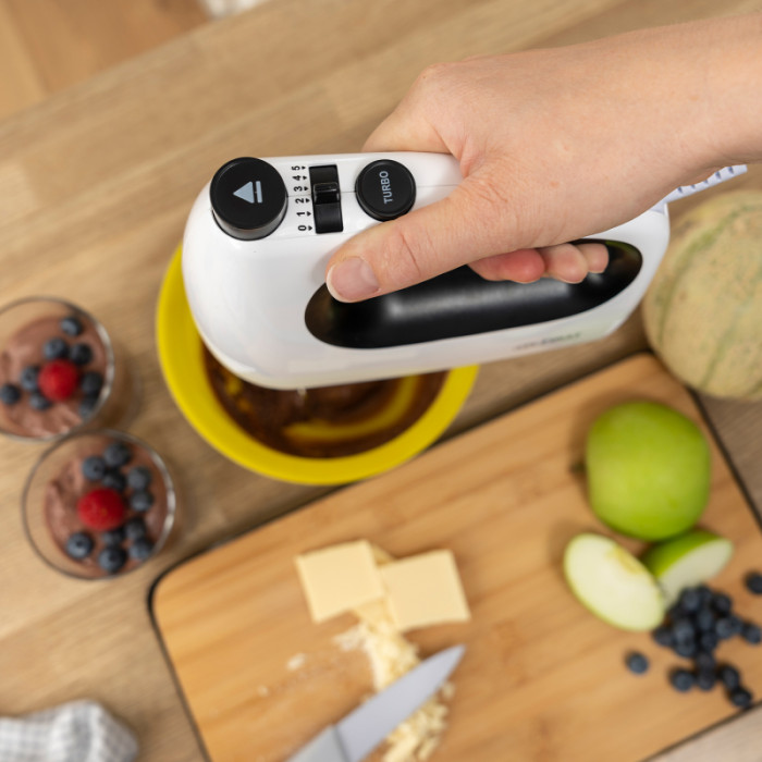 Стиль серед ручних міксерів. Найкраще управління в комплекті. Цей ручний міксер контролює будь-яке тісто: він забезпечує відмінне захоплення та легко чиститься. Насадки для віночка та гака для тіста виготовлені з нержавіючої сталі. 5 швидкостей плюс додаткова функція турбо забезпечують рівномірне перемішування, змішування та збивання. Це дозволяє отримувати однорідне тісто для млинців, печива та тортів, а також ідеально емульгований майонез, повітряні збиті вершки та міцні збиті яєчні білки.