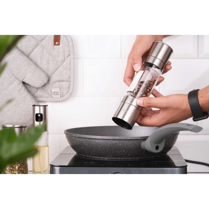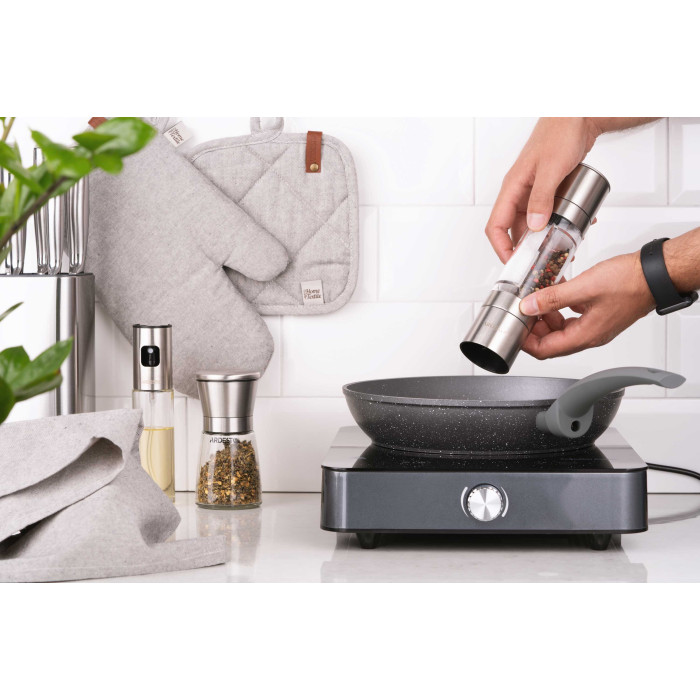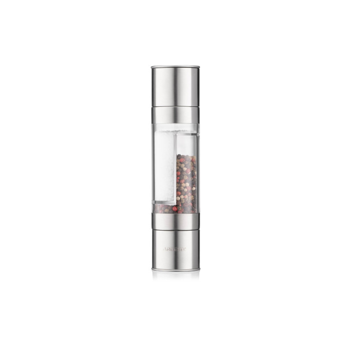 Млинок для солі та перцю 2 в 1 ARDESTO Gemini об’ємом 150 мл виготовлено з нержавіючої сталі та акрилу. Робота млинка здійснюється шляхом обертання однієї з рухомих частин, під час якого керамічне лезо перемелює вміст. Оснащений функцією регулювання ступеню помелу. Мити в посудомийній машині не можна.
