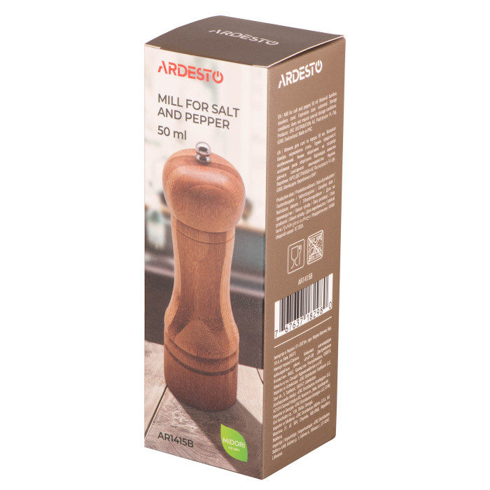 Млинок для солі та перцю ARDESTO серії Midori об’ємом 50 мл виготовлено з бамбука – екологічного матеріалу, який вирізняється довговічністю, та якісної нержавіючої сталі, що забезпечує тривалий термін слугування. Робота млинка здійснюється шляхом обертання однієї з рухомих частин, під час якого керамічне лезо перемелює вміст. Виріб не рекомендовано мити в посудомийній машині. Мати напохваті зручний млинок для приправ ARDESTO Midori доречно як на професійній, так і затишній домашній кухні.