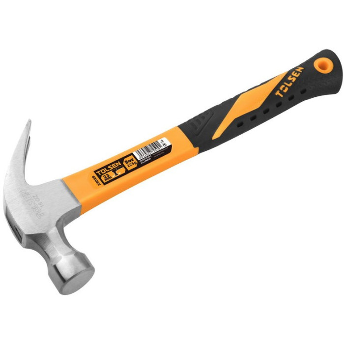 Молоток Tolsen призначений для забивання/висмикування цвяхів. Цей різновид ручного інструменту широко застосовується в роботі столярами і теслями. Головка з бойком круглої форми виготовлена з кованої інструментальної сталі спеціального гартування, що надає виробу міцність та подовжує термін його служби. Із захисно-декоративною метою поверхня відполірована. Ергономічна двокомпонентна рукоятка серії GRIPro зі скловолокна забезпечує зручність утримання інструменту в руці та відсутність ковзання в процесі експлуатації. Зручний вигин дозволяє надійно зафіксувати інструмент під час роботи.
