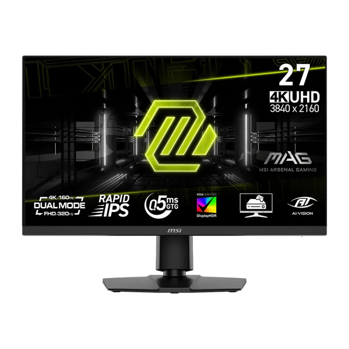 Монітор MSI MAG 272URDF-E16 — 27-дюймовий Rapid IPS-екран з роздільною здатністю 3840x2160, частотою 160 Гц, часом відгуку 0.5 мс, охопленням sRGB 131%, FreeSync, Pivot та HDR400. Подвійний режим (Dual Mode) для перемикання між UHD@160Hz та FHD@320Hz, підключення 2x HDMI, DP, 2x USB, аудіо. Чудово пасує для ігор з плавними кадрами та точними кольорами.