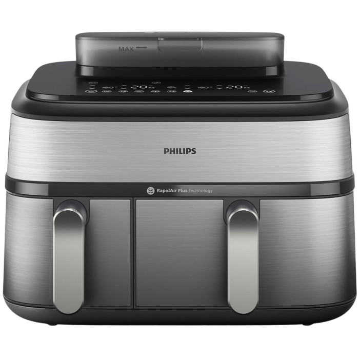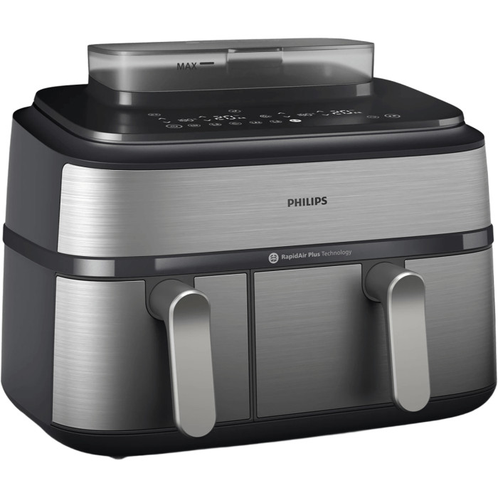 Мультипіч місткістю 9 л з 2 кошиками та функцією приготування на пару: знімна чаша на 6 л для основних страв, картоплі фрі та улюблених страв, а чаша на 3 л – для гарнірів та закусок. Вона вміщує до 1100 г картоплі фрі, 1600 г овочів або 12 курячих гомілок. У великий кошик поміститься ціла курка вагою 1,2 кг.