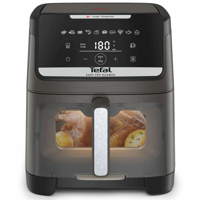 Tefal Easy Fry Silence XXL — тиха мультипіч із технологією Silent Technology, чашею 7 л та оглядовим вікном для контролю процесу без відкривання чаші. Extra Crisp забезпечує рівномірну циркуляцію гарячого повітря для хрусткої скоринки, Технологія Grill додає рум’яний колір і текстуру без зайвої олії. Є 10 автоматичних програм, сенсорне керування, ручний режим 40–220°C, знімна передня панель і система Easy Clean & Store.