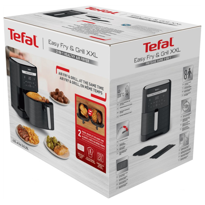Порадуйте свою сім'ю смачними, корисними для здоров'я стравами з власної кухні з фритюрницею і грилем Tefal Easy Fry & Grill 2-в-1. Знімна перегородка Flexcook дає змогу легко перемикатися з місткості XXL, яка вміщує порцію для 8 осіб, на дві зони для одночасного приготування двох різних страв. Технологія надзвичайно хрусткого смаження та лита решітка гарантують ідеальне прожарювання - хрустке ззовні та ніжне всередині з меншою кількістю олії. З 8 автоматичними програмами можливості безмежні!