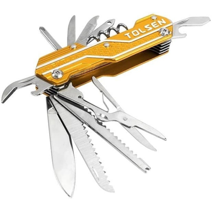 Мультитул Tolsen, 15 елементів, інструмент для витягування гачків, інструмент для чищення риби, иінструмент для догляду за нігтями, викрутка хрестова мала, пилочка для нігтів, штопор, пила, відкривачка для консервів, ніж, викрутка шліцева, голка, пробивач для шкіри. Компактний та зручний у використанні, він ідеально підходить для активного відпочинку, риболовлі, туризму або щоденних завдань.