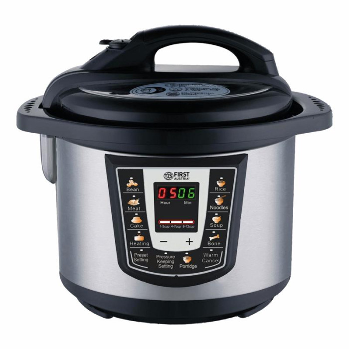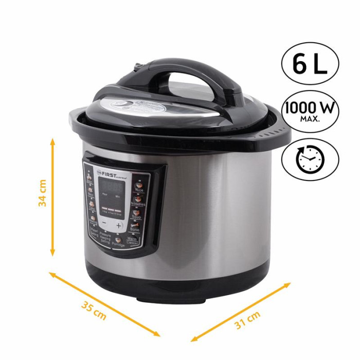 Цікаве дизайнерське оформлення мультиварки-скороварки First FA5130 дозволить стати їй прикрасою Вашої кухні, а наявність зручної для захоплення і утримування в руці ручки забезпечить додаткову зручність в повсякденній експлуатації. Досить великий обсяг каструлі мультиварки-скороварки на 6 л дозволить приготувати багато смачної і корисної їжі для великої родини, витрачаючи на це мінімум часу. Вибирати одну з дев"яти програм приготування або активувати додаткові функції буде набагато простіше і зрозуміліше, завдяки електронній системі управління, а збереження програми в разі непередбачених перебоїв електроенергії стане відмінним доповненням до простоти використання.