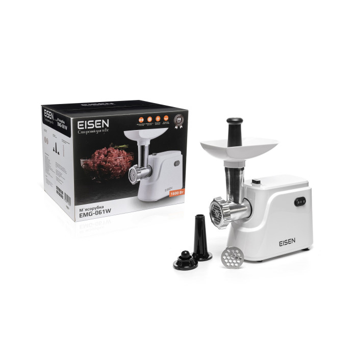 М'ясорубка EISEN EMG-061W - це чудовий вибір для тих, хто цінує якість та надійність кухонних приладів. Висока продуктивність, надійні матеріали, різноманітні насадки та додаткові функції роблять цю м'ясорубку ідеальним помічником на будь-якій кухні.