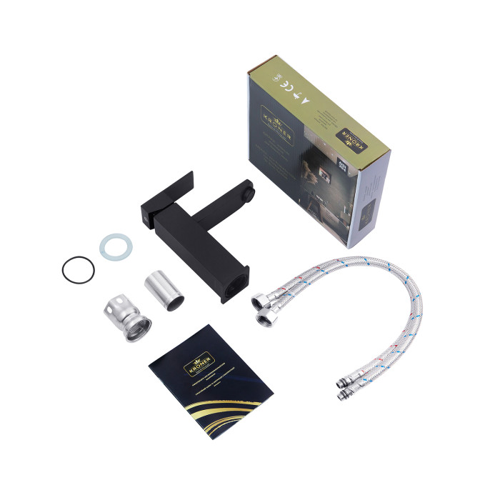Змішувач, лійка з кронштейном для верхнього душу, лійка з кронштейном для ручного душу, душовий шланг, шлангове під‘єднання, кріплення. \ Змішувач, гнучка підводка, кріплення, інструкція.