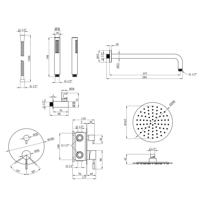 Змішувач, кронштейн для верхнього душу, лійка для верхнього душу, кронштейн для ручного душу, лійка для ручного душу, душовий шланг, кріплення. \ Змішувач, гнучка підводка, кріплення, інструкція. \ Змішувач, шланг для душу, лійка для гігієнічного душу, кріплення, інструкція.
