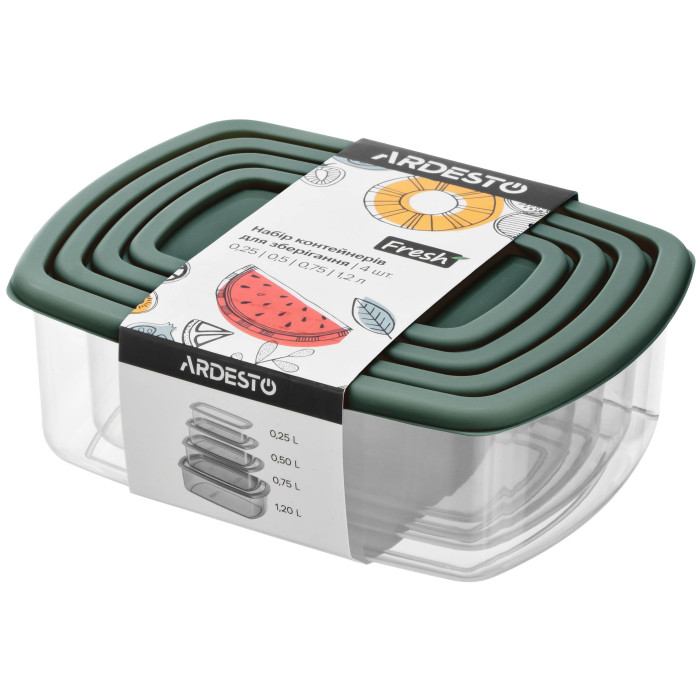 Набір контейнерів для зберігання харчових продуктів ARDESTO Fresh 0.25/0.5/0.75/1.2л, пластик, прямокутна, зелений
