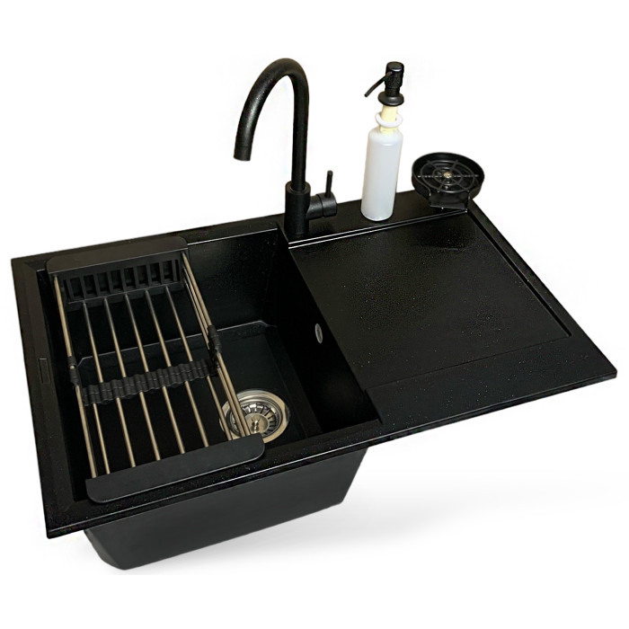 Набір кухонний Adamant Horizon, штучний камінь, прямокут., з крилом, 780х495х230мм, чаша - 1, врізна, чорний + змішувач + дозатор + ополіскувач склянок + коландер
