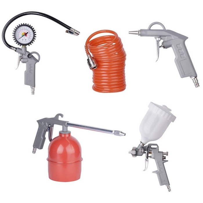 Набір пневмоінструменту EnerSol EPS-5 складається з п'яти елементів для роботи зі стисненим повітрям: продувний пістолет з тиском 4–8 бар, миючий пістолет, пульверизатор, пістолет для підкачування коліс та спіральний шланг. Миючий пістолет працює без окремого резервуара під тиском, призначений для нанесення рідин через подачу повітря. Спіральний нейлоновий шланг довжиною 5 м з конектором забезпечує гнучке підключення до компресора.