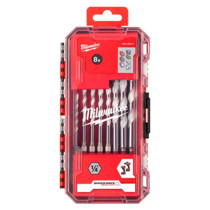 Набір свердел Milwaukee SHOCKWAVE Multi-Material Drill Bit Set складається з 8 високоякісних свердел, призначених для роботи з різними матеріалами. Цей набір забезпечує ефективне свердління в бетоні, цеглі, черепиці, тонкому металі, керамічній плитці, деревині, ПВХ, алюмінію, гіпсокартону та інших матеріалах.