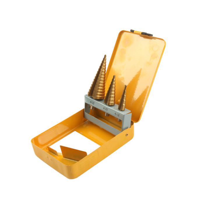 Набір свердел по металу Tolsen 75878 включає три східчасті свердла розмірів: 4-12×2 мм, 4-20×2 мм, 4-32×2 мм. Виготовлені з швидкорізальної сталі (HSS) з титановим покриттям для підвищення зносостійкості. Поставляється в зручному кейсі для зберігання.