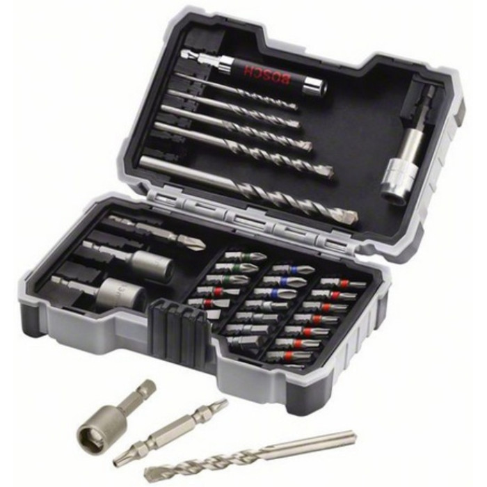 Набір Bosch Professional Mixed 2.607.017.326 містить 35 насадок для загвинчування різних типів кріплення. До комплекту входять біти PH, PZ, SL, Hex та Torx, а також універсальний магнітний тримач. Усі елементи виконані з високоміцної сталі S2 з точним профілем робочої частини. Набір охоплює найпоширеніші розміри для щоденної роботи з шуруповертами та дрилями. Упаковка компактна, зручна для зберігання та транспортування.