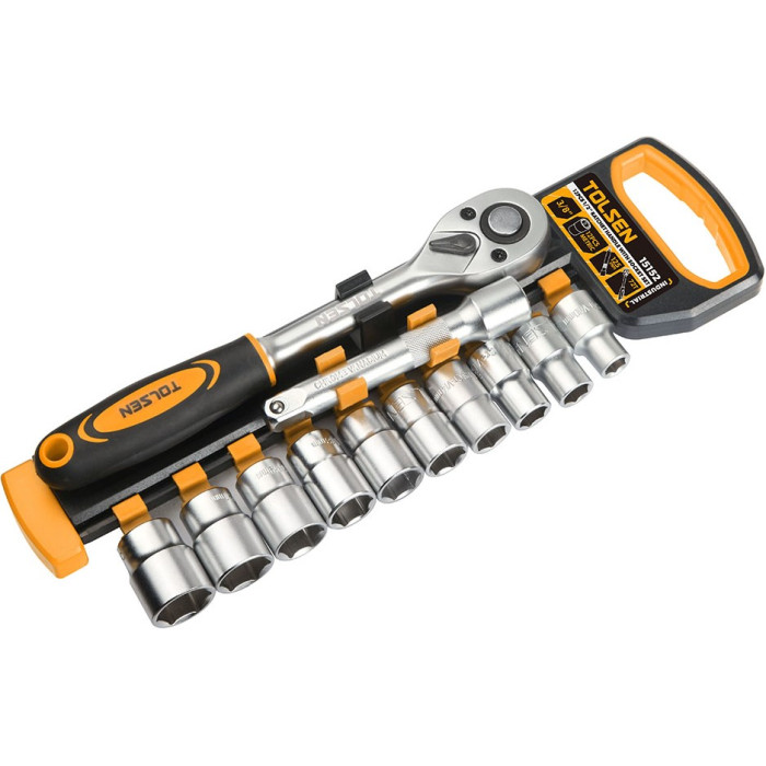 Набір торцевих головок Tolsen 1/2" включає 12 предметів. В якості матеріалу для виготовлення пристосувань використана кована інструментальна CrV-сталь з матовим «сатиновим» хромуванням, що захищає поверхню від корозії і тим самим подовжує термін служби ручного інструмента. Двокомпонентна рукоятка з храповим механізмом завдяки ергономічній формі і компактним розмірам забезпечує зручність експлуатації пристосувань і можливість застосування у важкодоступних місцях. Завдяки універсальності комплект підходить для застосування в усіх галузях.