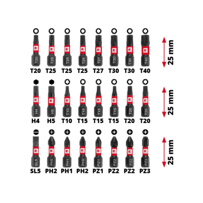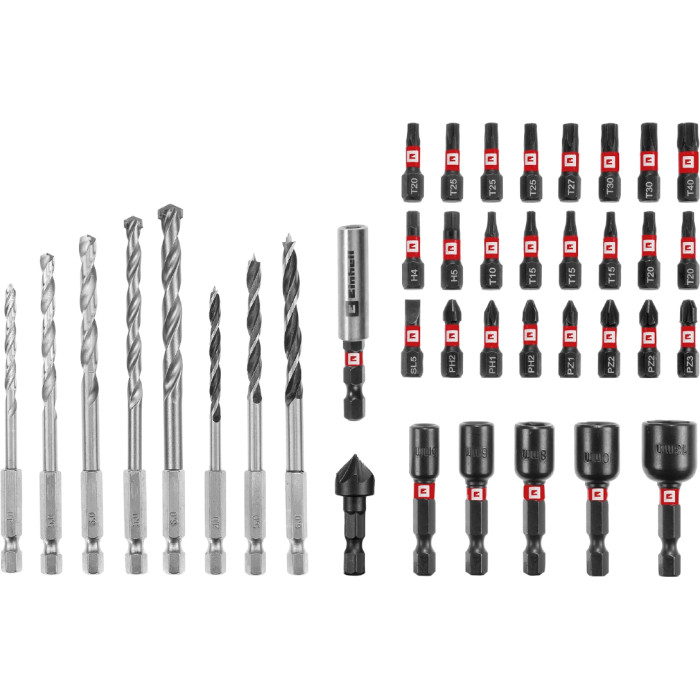 Einhell M-Case (39 од.) — набір для шуруповертів і дрилів: 24 біти 25 мм (C6.3; PH/PZ/SL/T/H; сталь S2, марганцево-фосфатована), 3 свердла по металу HSS 4/5/6 мм (E6.3), 3 по дереву C45 4/5/6 мм, 2 по каменю 6/8 мм, 5 торцевих головок 5–13 мм та магнітний бітотримач. Усе в міцному кейсі з прозорою кришкою та автофіксацією.