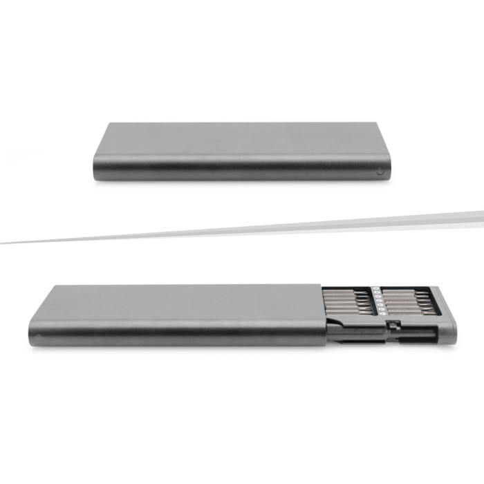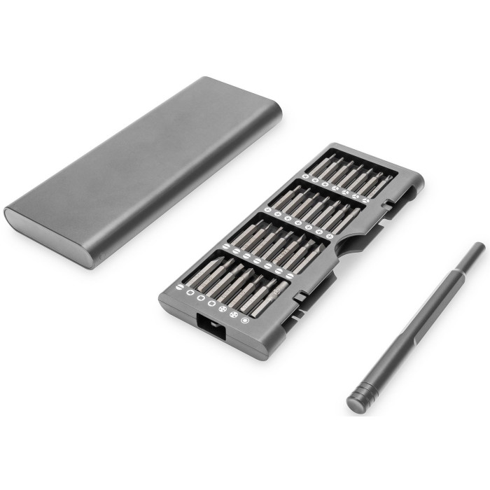 Набір інструментів DIGITUS містить великий вибір насадок для викруток і поставляється в зручній алюмінієвій коробці, яку легко транспортувати та швидко готувати до використання. Наконечники викрутки виготовлені з високоякісної інструментальної сталі S2, тому міцні та довговічні. Зокрема, для ремонту смартфонів, встановлення комп’ютерних аксесуарів або для виготовлення моделей завжди доступна відповідна насадка для викрутки.