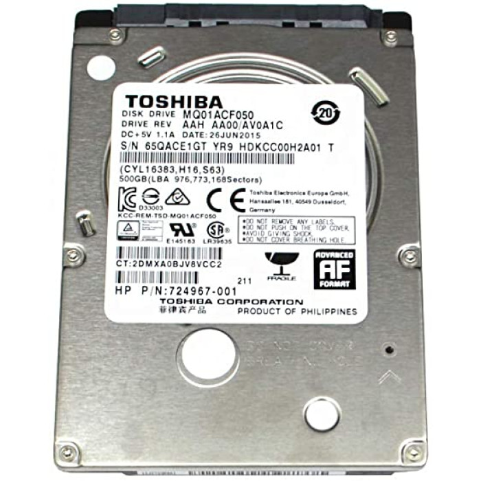 Toshiba MQ01ACF050 – це жорсткий диск з ємністю 500GB, призначений для використання в ноутбуках та інших портативних пристроях. Завдяки швидкості обертання 7200 об/хв та інтерфейсу SATA 6Gb/s, цей диск забезпечує високу швидкість доступу до даних, що робить його чудовим вибором для щоденних задач і зберігання важливих файлів, документів та мультимедійних даних.