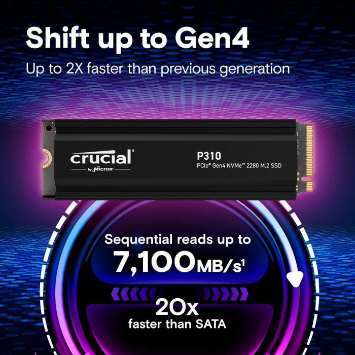 SSD Crucial P310 M.2 об’ємом 1 ТБ з інтерфейсом PCIe 4.0 забезпечує надвисоку швидкість роботи до 7100 МБ/с при читанні. Вбудований радіатор покращує тепловідведення та підтримує стабільну продуктивність під навантаженням.