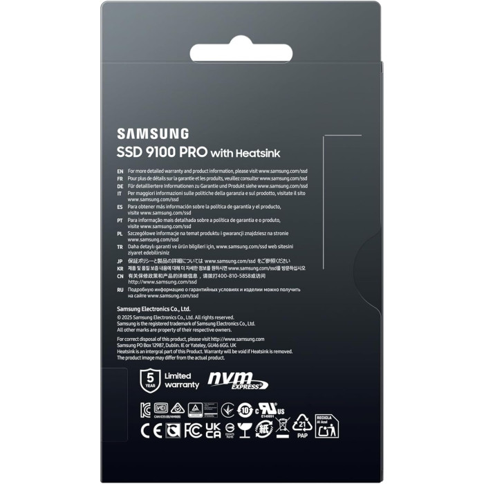 Samsung 9100 PRO 1TB — це надшвидкий SSD нового покоління з інтерфейсом PCIe 5.0, що забезпечує неймовірну швидкість читання до 14 700 МБ/с і запису до 13 300 МБ/с. Завдяки вбудованому радіатору та технології Dynamic Thermal Guard, накопичувач ефективно розсіює тепло, забезпечуючи стабільну роботу навіть під високими навантаженнями. Цей SSD ідеально підходить для геймерів, творців контенту та професіоналів, які працюють з великими обсягами даних, включаючи 4K-відео, 3D-графіку та AI-застосунки. Сумісний з ПК, ноутбуками та PlayStation 5, він пропонує надійність, високу продуктивність та довговічність завдяки використанню V-NAND TLC пам'яті та власного контролера Samsung.
