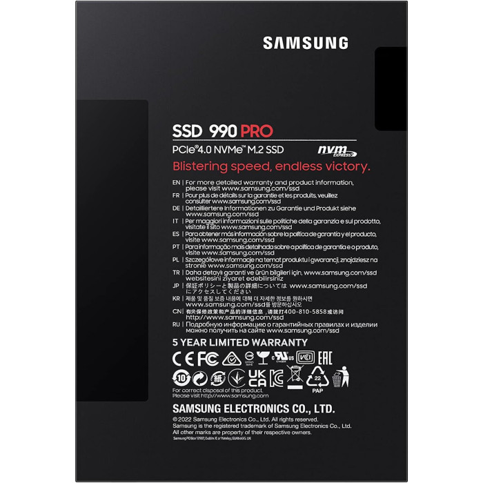 Samsung 990 Pro 2280 — твердотельный накопитель внутреннего типа. Изготовлен в компактном форм-факторе M.2, предназначен для тонких современных систем. Обеспечит систему бешеной скоростью работы, обработки данных и запуска «тяжелых» приложений. Высокая емкость, небольшой размер, а также облегченная конструкция обеспечивает высокую надежность и эффективность передачи для ультратонких мобильных устройств нового поколения.