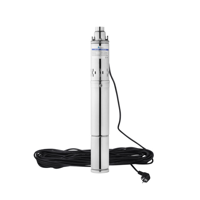 Глибинний насос Agua 3S QGD 1.8-75-0.37 призначений для подачі чистої або слабко забрудненої води зі свердловин діаметром від 3 дюймів. Завдяки шнековому механізму забезпечує стабільний тиск навіть при невеликому дебіті. Потужність двигуна 370 Вт дозволяє досягати напору до 75 м і продуктивності до 30 л/хв. Насос оснащений вбудованим пусковим конденсатором та 10-метровим кабелем живлення.